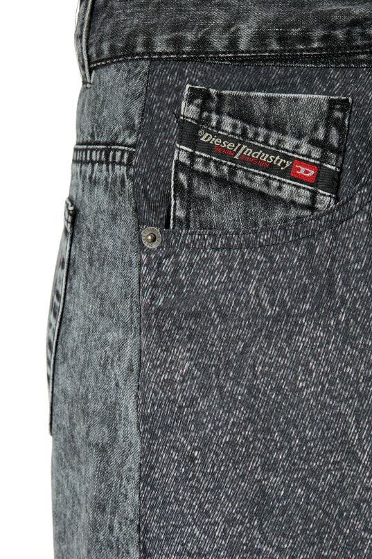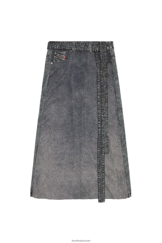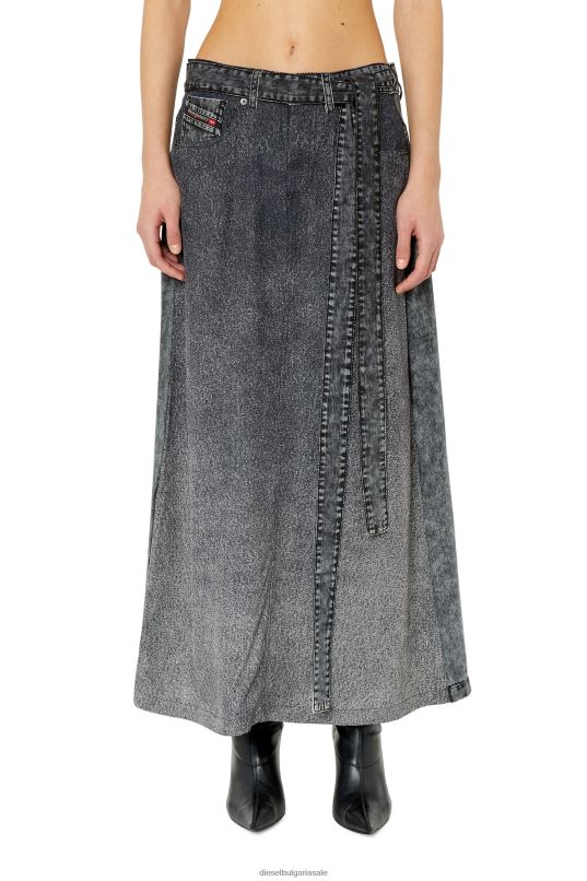 дълга стандартна пола, изрязана от кепър, изпреден с вискозни влакна ecovero, дигитално отпечатан за дънков ефект trompe l'oeil в сиво изпиране. стилизиран с дънкова лента на талията и странични връзки, той включва емблематичния детайл на петия джобен флаг на Diesel.